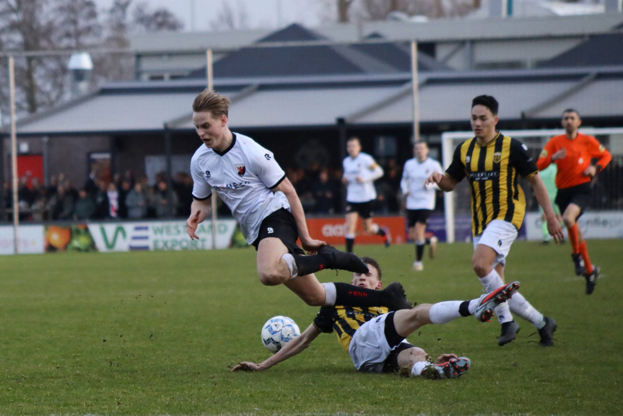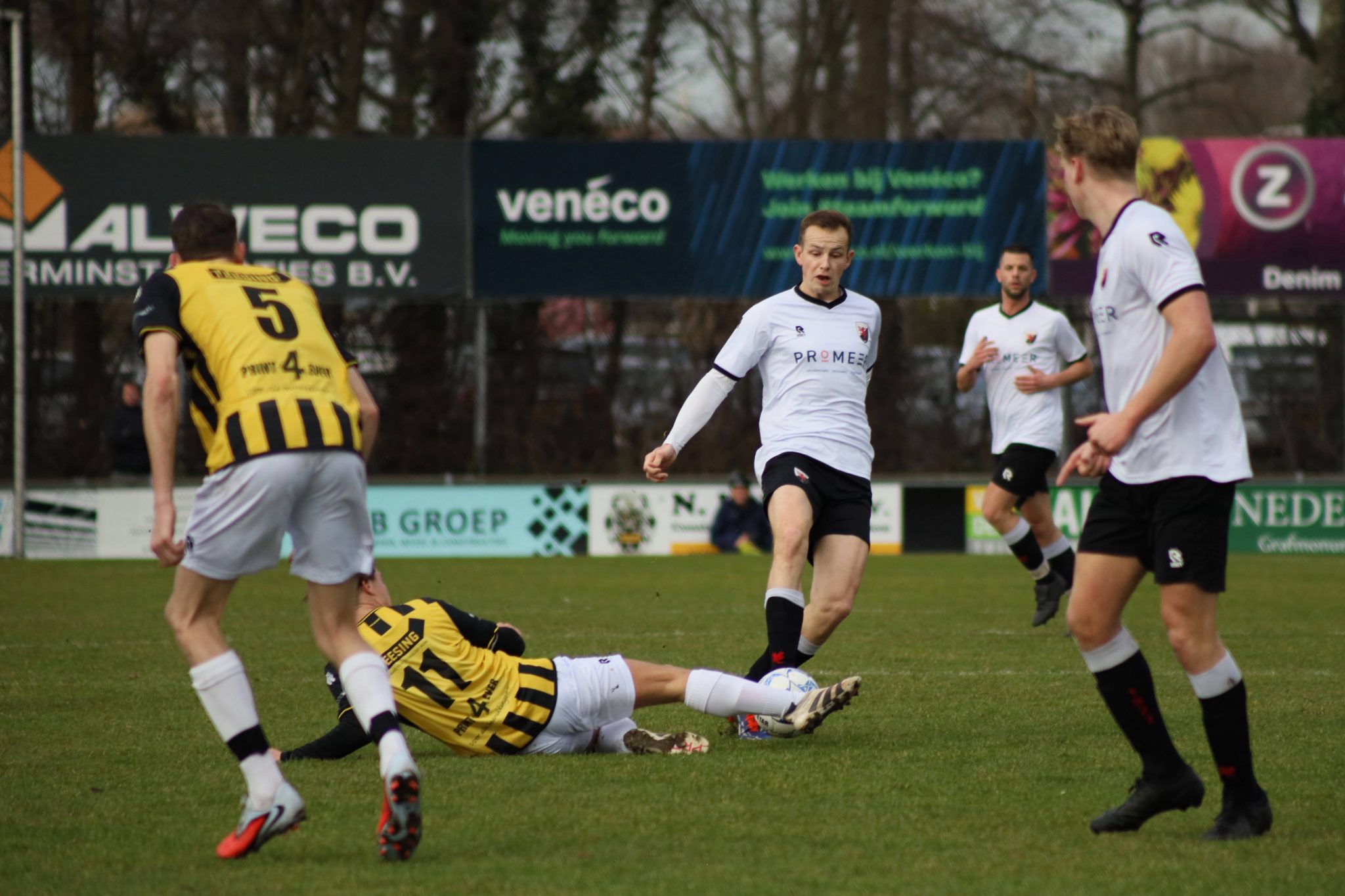 Naaldwijk 2 mocht deze zaterdag voor de tweede keer op rij aantreden op eigen veld en kreeg bezoek van Verburch 2, een ploeg waar eerder dit seizoen met 2-2 gelijk tegen werd gespeeld, in een wedstrijd waarin meer had ingezeten. Op basis van de ranglijst leken wij vooraf de favoriet, maar daar bleek in de praktijk weinig van terecht te komen. Er werd gezapig aan de wedstrijd begonnen, waar enkele kansen gecreëerd werden, maar ook Verburch liet zich gelden en verzuimde zelfs een mogelijkheid op leeg doel. Niet veel later leidde balverlies diep op onze eigen helft een aanval van Verburch in, die met wat geluk werd afgerond: 0-1. Wij moesten in de achtervolging, maar hadden moeite om echt tot uitgespeelde aanvallen te komen. Toch viel halverwege de eerste helft de gelijkmaker. Via de linkerkant werd goed doorgekomen en de bal belandde bij Adil Oulad Massoud op de rand van het strafschopgebied. Die haalde schitterend uit en plaatste de bal in de rechterbovenhoek: 1-1. Lang konden wij echter niet genieten van die treffer. Met een lange bal speelde Verburch onze defensie uit en opnieuw was het raak: 1-2. In de slotfase van de eerste helft kregen wij nog een vrije trap. De hoge voorzet zorgde voor onrust in het strafschopgebied, waarna de scheidsrechter een overtreding constateerde en naar de stip wees. Adil Oulad Massoud bleef opnieuw koel en schoot de penalty beheerst door het midden binnen: 2-2 bij rust. Er was duidelijk werk aan de winkel, want het spel en de strijdlust van de afgelopen weken waren nog niet zichtbaar. Toch verliep ook de tweede helft moeizaam. Beide ploegen kwamen moeilijk tot kansen, al wist Verburch halverwege de tweede helft wel opnieuw de leiding te nemen. De rechtsbuiten kreeg de bal enigszins gelukkig mee, maar rondde daarna beheerst af in de lange hoek: 2-3. Wij voerden enkele wissels door om meer aanvallende impulsen te brengen. Dat leidde tot één grote kans: Jesse Pakvis zette goed door aan de rechterkant en leverde een perfecte voorzet af op Randy van Schelt. Die kopte knap in, maar werd fraai gekeerd door de keeper van Verburch. Het leek erop dat Naaldwijk met lege handen zou blijven, totdat in blessuretijd Senna Hulleman van afstand uithaalde. De keeper wist dit schot niet goed te verwerken en Randy er scherp bij was om de rebound binnen te schieten: 3-3. Meer zat er vandaag echt niet in en met dit punt mogen wij uiteindelijk tevreden zijn. De komende vier weken staat er geen competitiewedstrijd op het programma. Op 28 februari hervatten wij de competitie met een wedstrijd tegen Brielle, vol goede moed en met de overtuiging dat het trainingskamp in Torremolinos in de tussentijd zijn vruchten zal afwerpen!